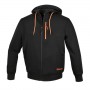 Fiksna kapuljača, bez mogućnosti skidanja, s okruglim narančastim vezicama za regulaciju.